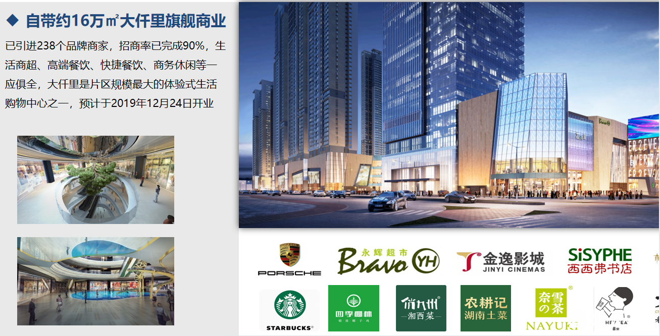 - 商业配套:无缝对接16万㎡大仟里购物中心,汇聚超250家品牌商家,涵盖高端餐饮、商务休闲、生活商超等业态,周边还有海雅缤纷城、壹方城等成熟商业集群,满足商务接待与日常消费需求