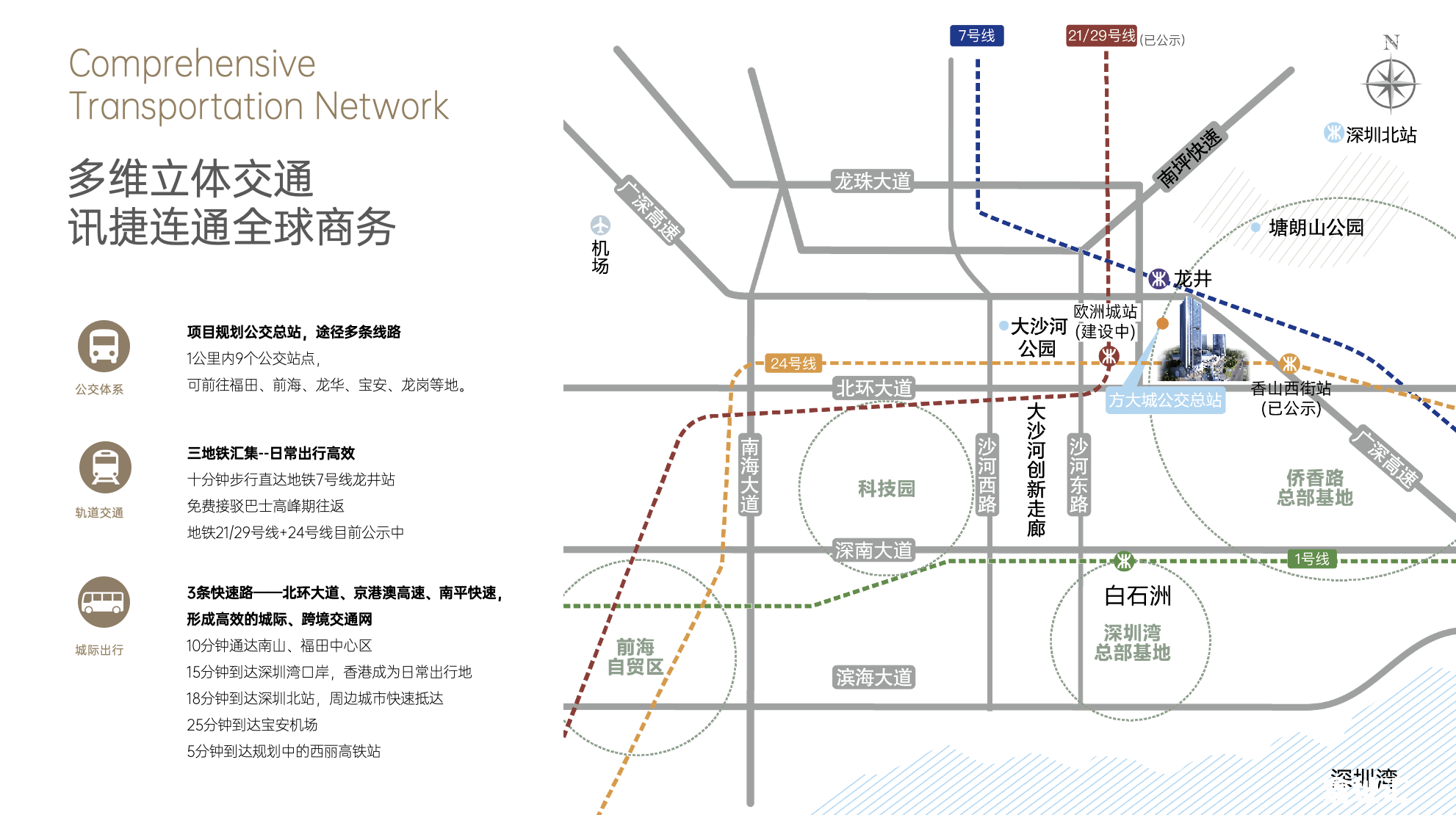 紧邻地铁 7 号线龙井站,步行可达;规划中的 21/24/29 号线将在此形成核心枢纽,未来交通网络更完善。30 分钟内畅达福田 CBD、南山科技园、前海自贸区等核心区域,无论是员工通勤还是商务出行,都能畅通无阻,节省时间成本。